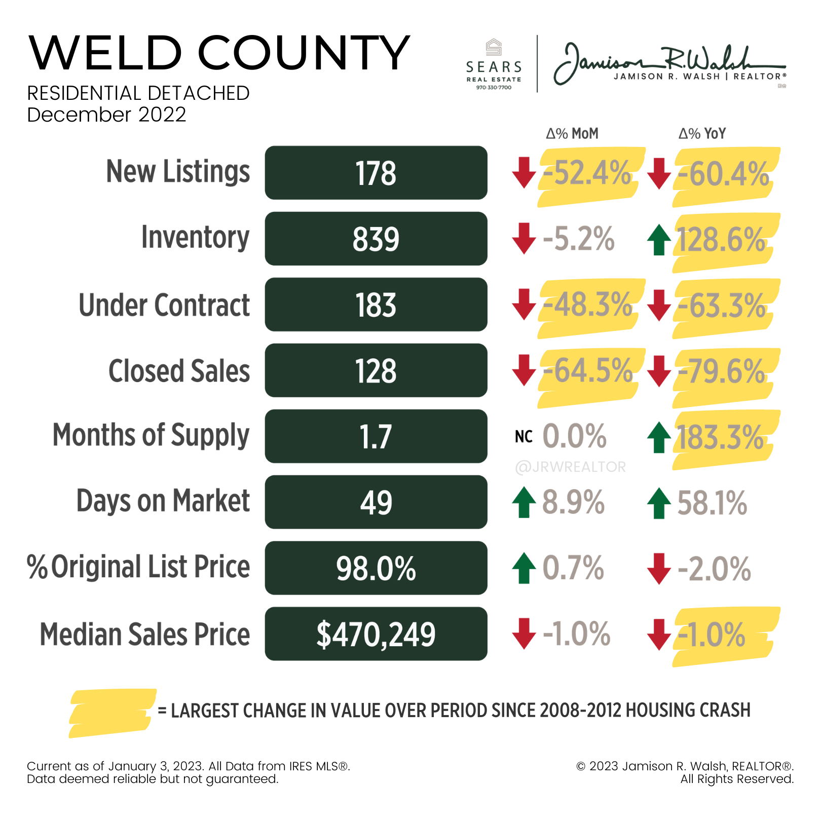 As the Pandemic Housing Boom fizzled out this summer, inventory went through the roof. In Weld County, inventory jumped 206% between February 2022 and August 2022, while Closed Sales tanked buy nearly 40% on a YoY basis. Fast forward to December and Inventory, despite being up over 128% YoY, continues to fall at a steady rate each month as the decline in the number of new listings accelerates, with December posting a third consecutive MoM drop in available inventory, ending the month with 839 single family homes for sale. Likewise, the number of properties that were put Under Contract absolutely collapsed in December to just 183 homes Under Contract, representing an over 48% MoM decline and over 63% YoY decline. This again marks the largest MoM and YoY decline ever recorded as well as the fewest number of homes to go Under Contract in one month since January 2013, when 222 homes were contracted for purchase.